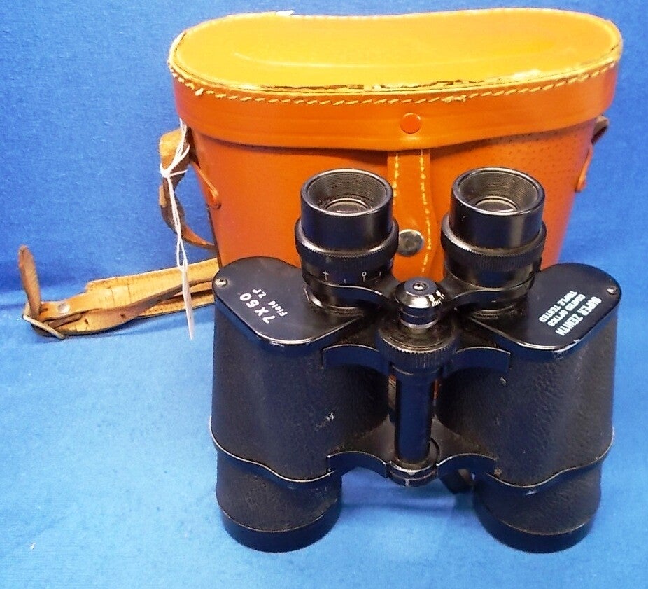 Prachtige verrekijker waar je inderdaad 'ver mee kunt kijken' in leren tas, 7x50 is de vergrootfactor