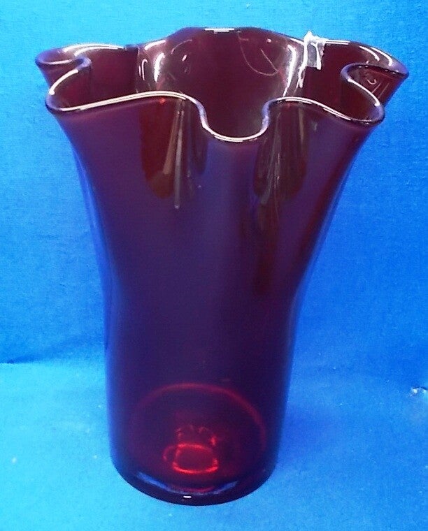 Donkerrode glazen vaas met 'Handkerchief' rand, 29 cm hoog.