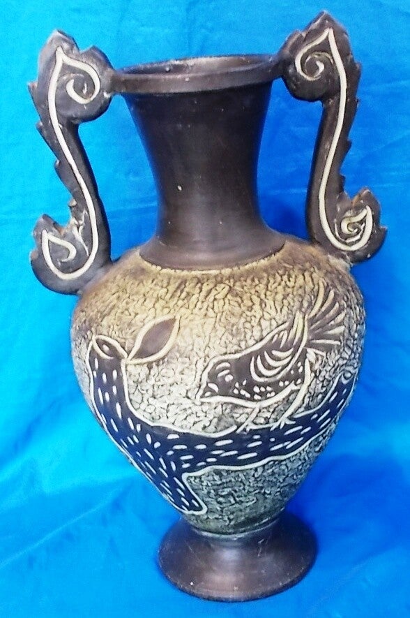 Grote vaas/pot in diverse tinten grijs/zwart, in reliëf gemaakt voor binnen en buiten 63 cm hoog en 40 cm breed over de handvatten