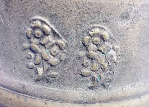 Schitterende gegoten bronzen (koeien) bel van een zware kwaliteit, 19 cm hoog, 21 cm diameter. Ook de leren riem is aanwezig, de klank is prachtig!, Rondom de rand is allerlei decoratie aangebracht.