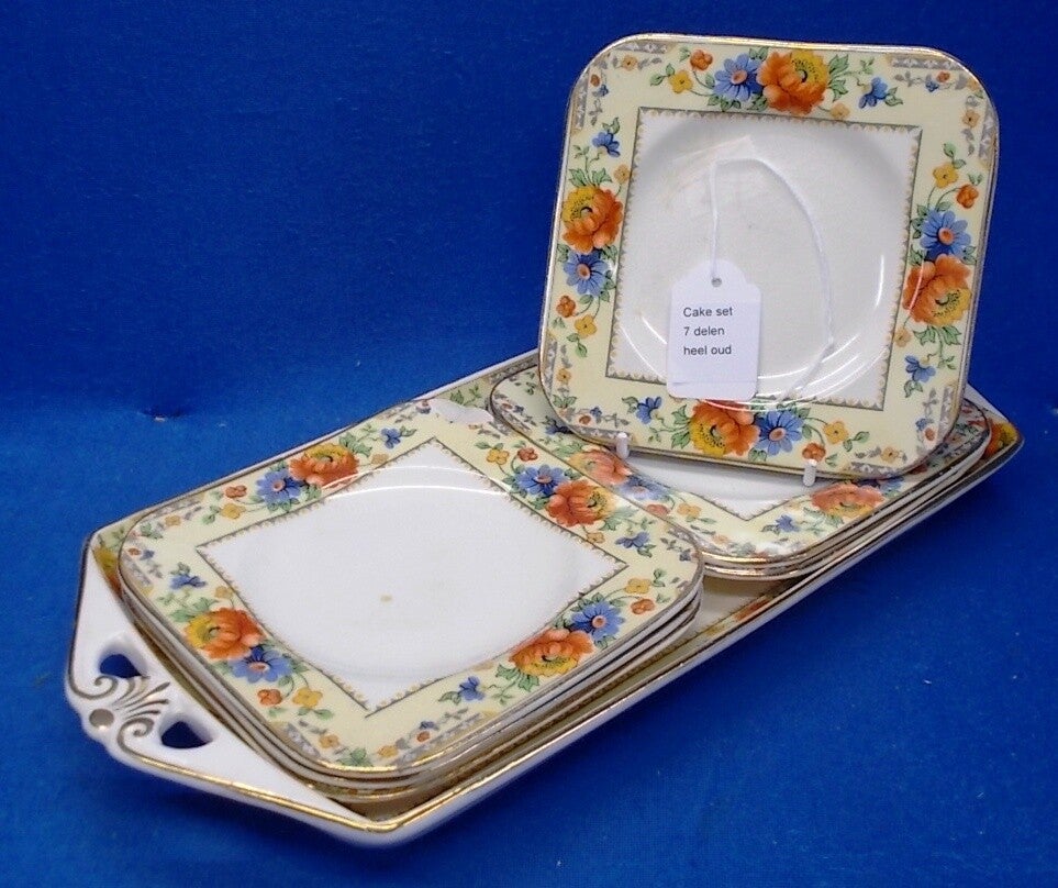 Prachtige antieke schaal met 5 vierkante bordjes, oud en met gebruikssporen, heel decoratief