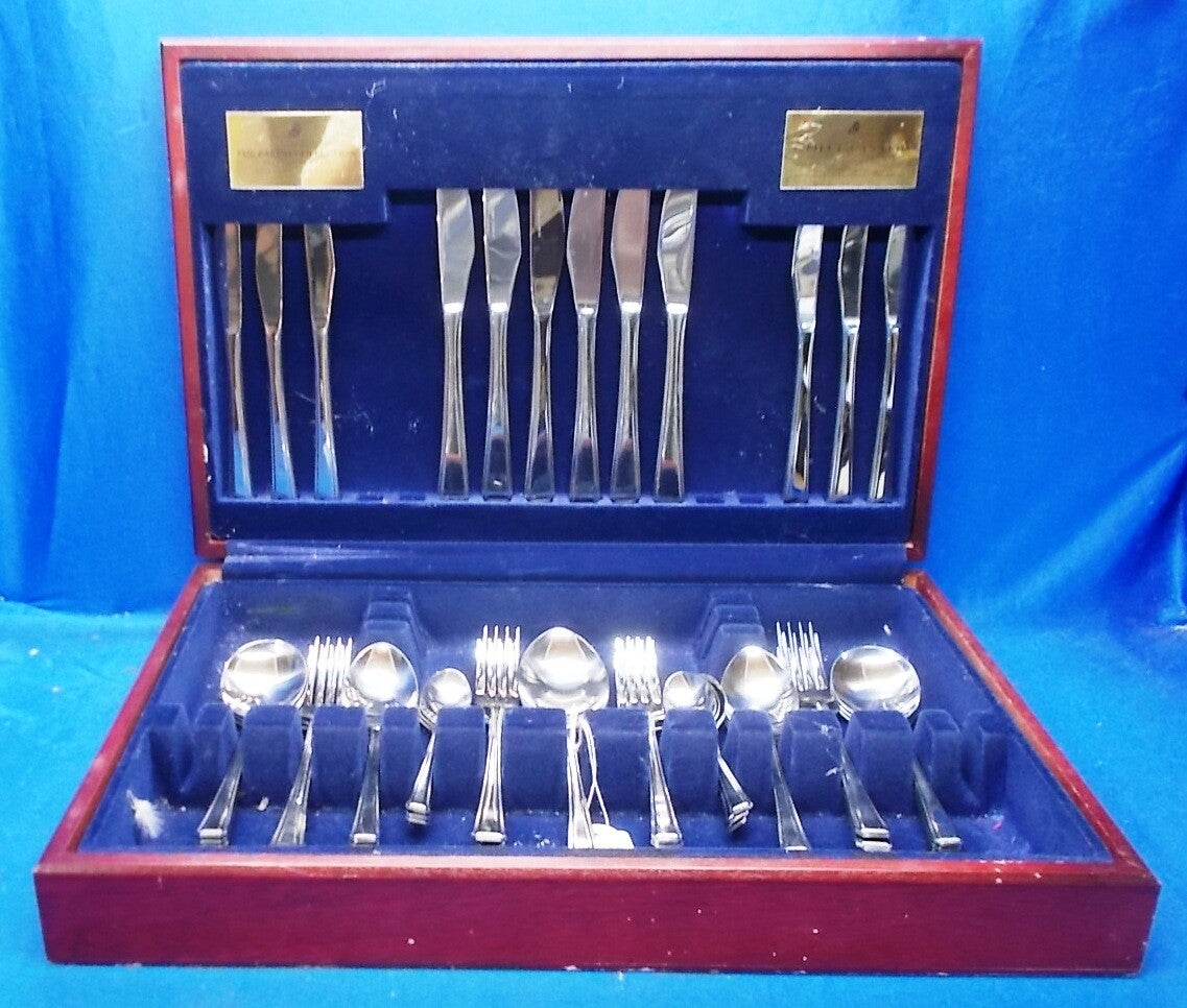 TOTAAL 44 delen in een houten cassette, oorspronkelijk voor acht personen, deze ZES persoons bestekset is splinternieuw en kan in de vaatwasser.