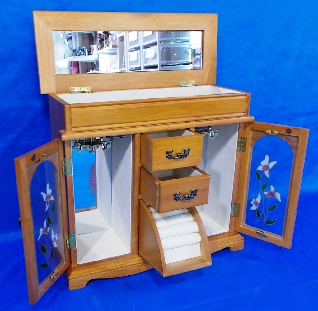 Prachtige sieraden opbergkast met twee deuren en lades in perfecte nagenoeg nieuwe staat, plaats voor al uw sieraden.