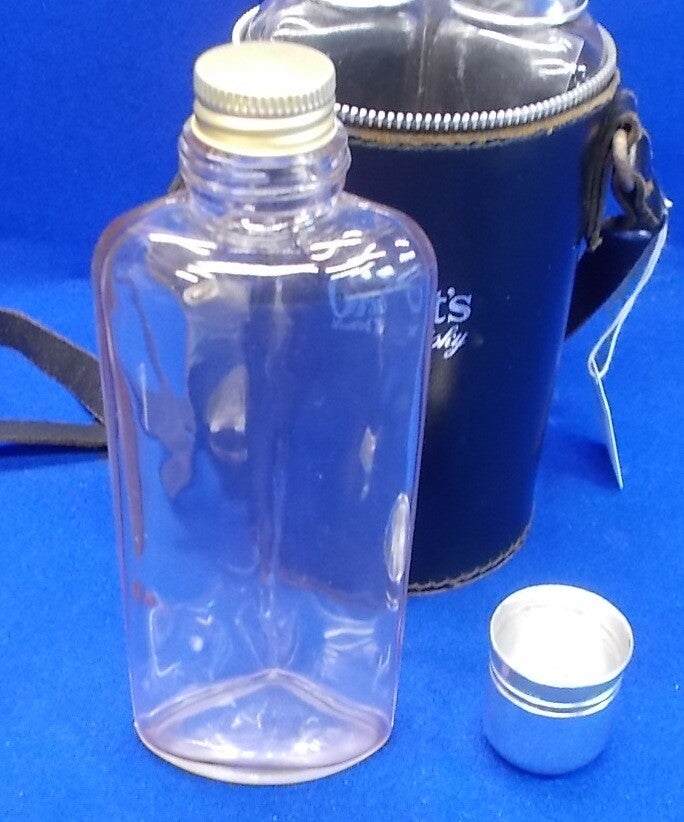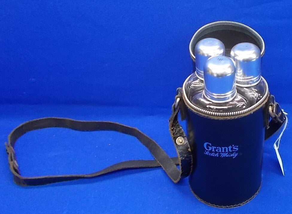 Leren schoudertas met drie flacons voor drie verschillende drankjes.